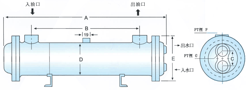 | 形式編號(hào) | A | B | C | D | E | F | G | 散熱管 | 散熱面積 | 油箱容量 | 重量 | 泵浦流量 | 水流量 |